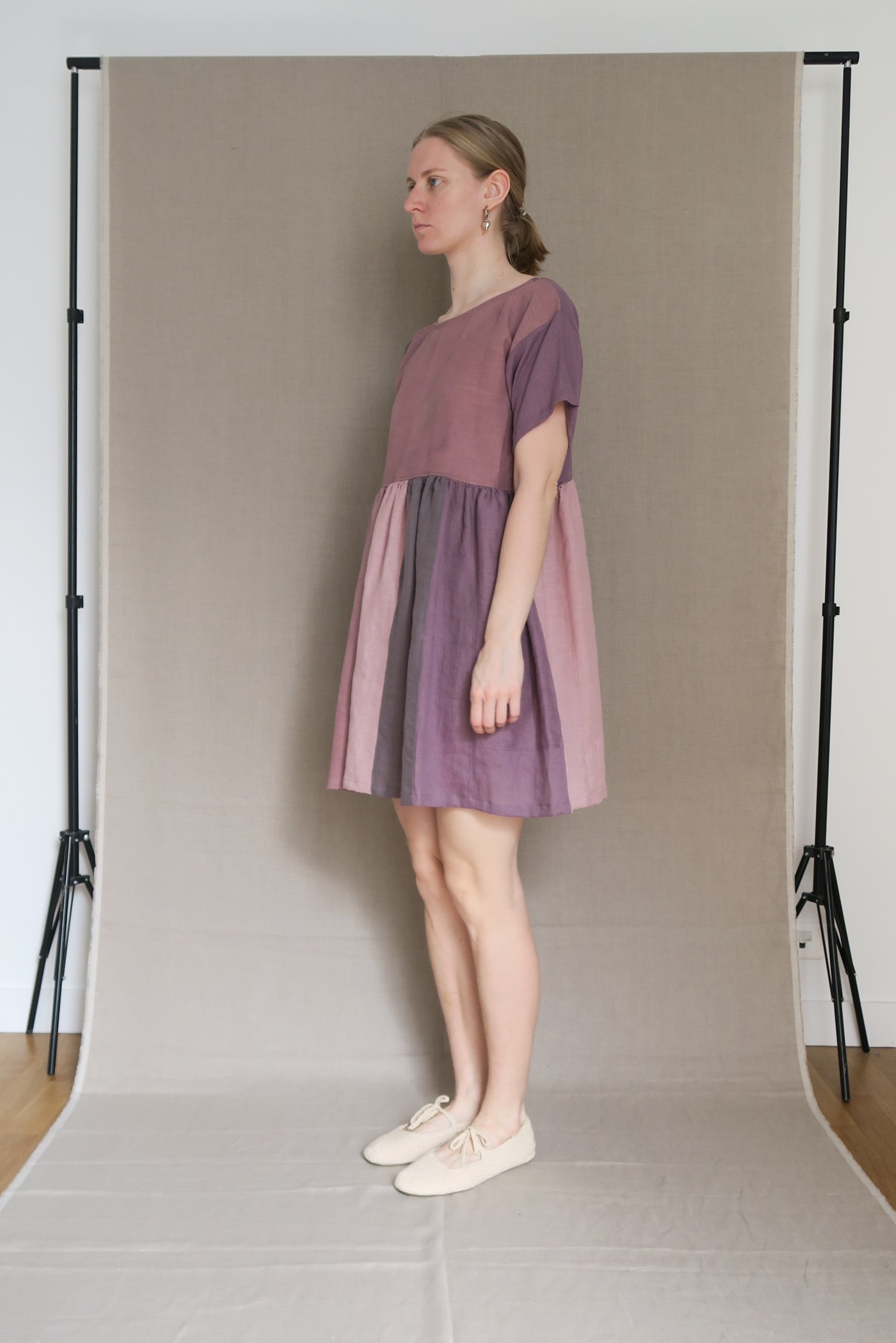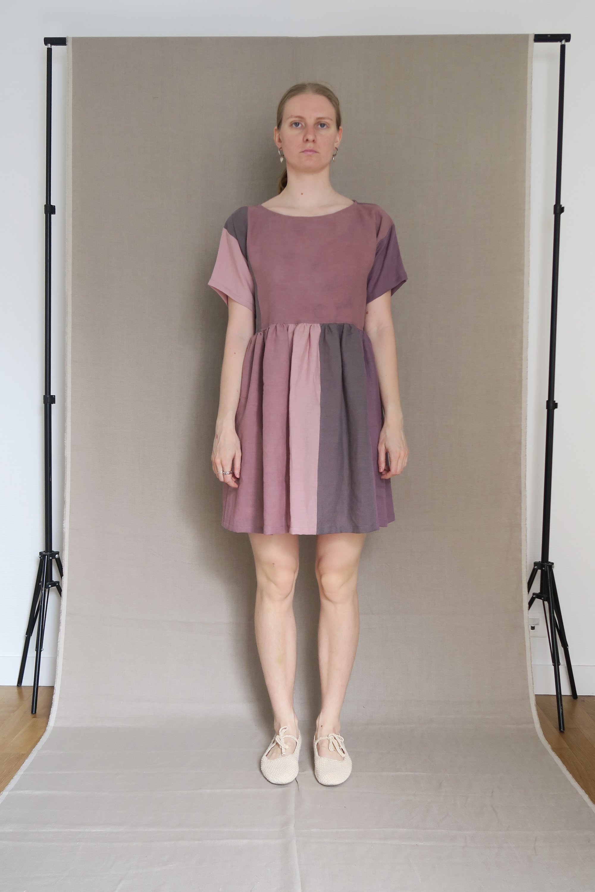 Patchwork dresses are very special one of one creations, made from the last bits of various fabrics I make collages of colors and patterns to create dresses that can be work both ways. The label is sewn on the side, the neckline is the same front and back, the dress doesn't have the front or back. These dresses take a longer time to make than a simple one fabric dress, starting from the hunt for the right matches, to assembly of the panels.