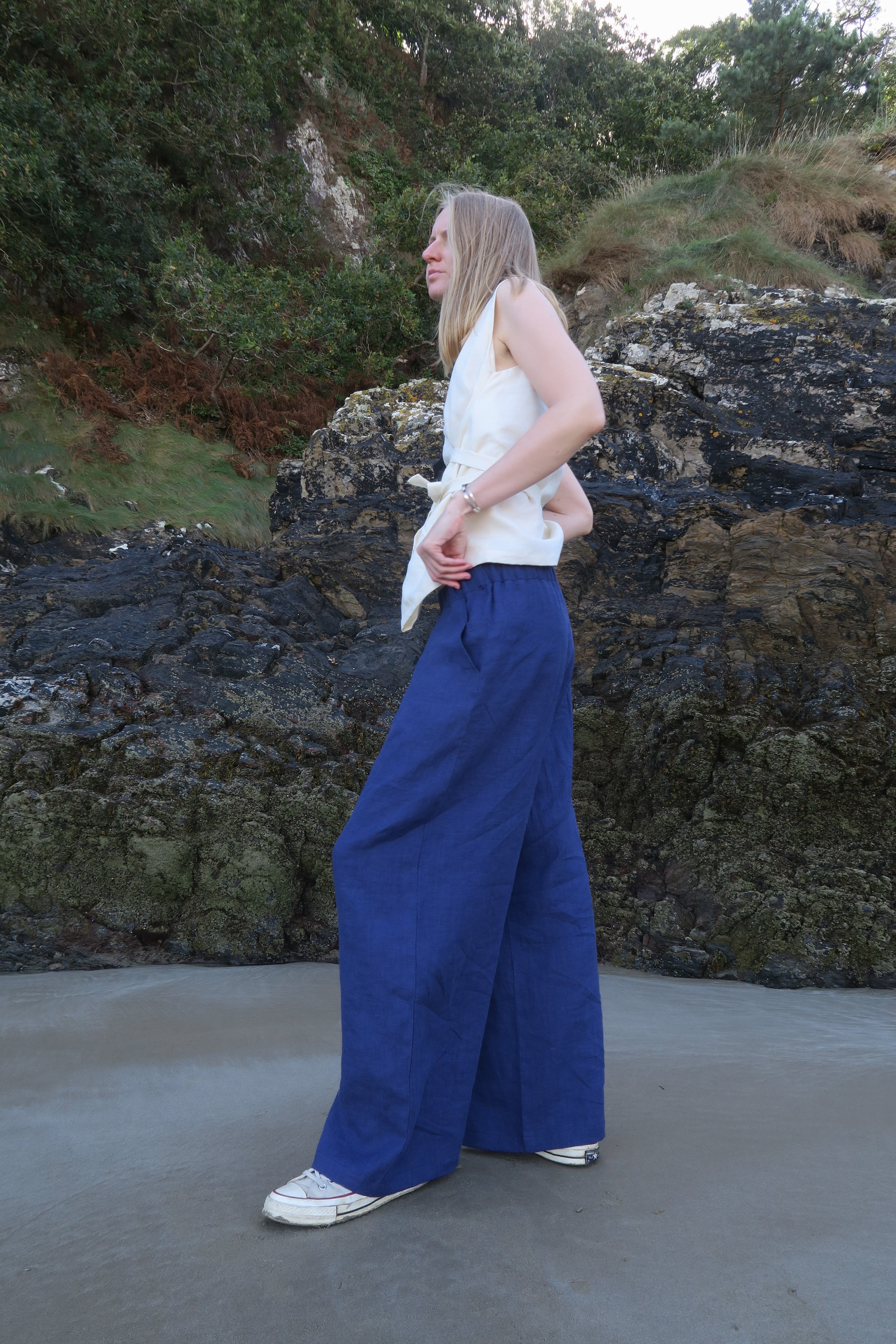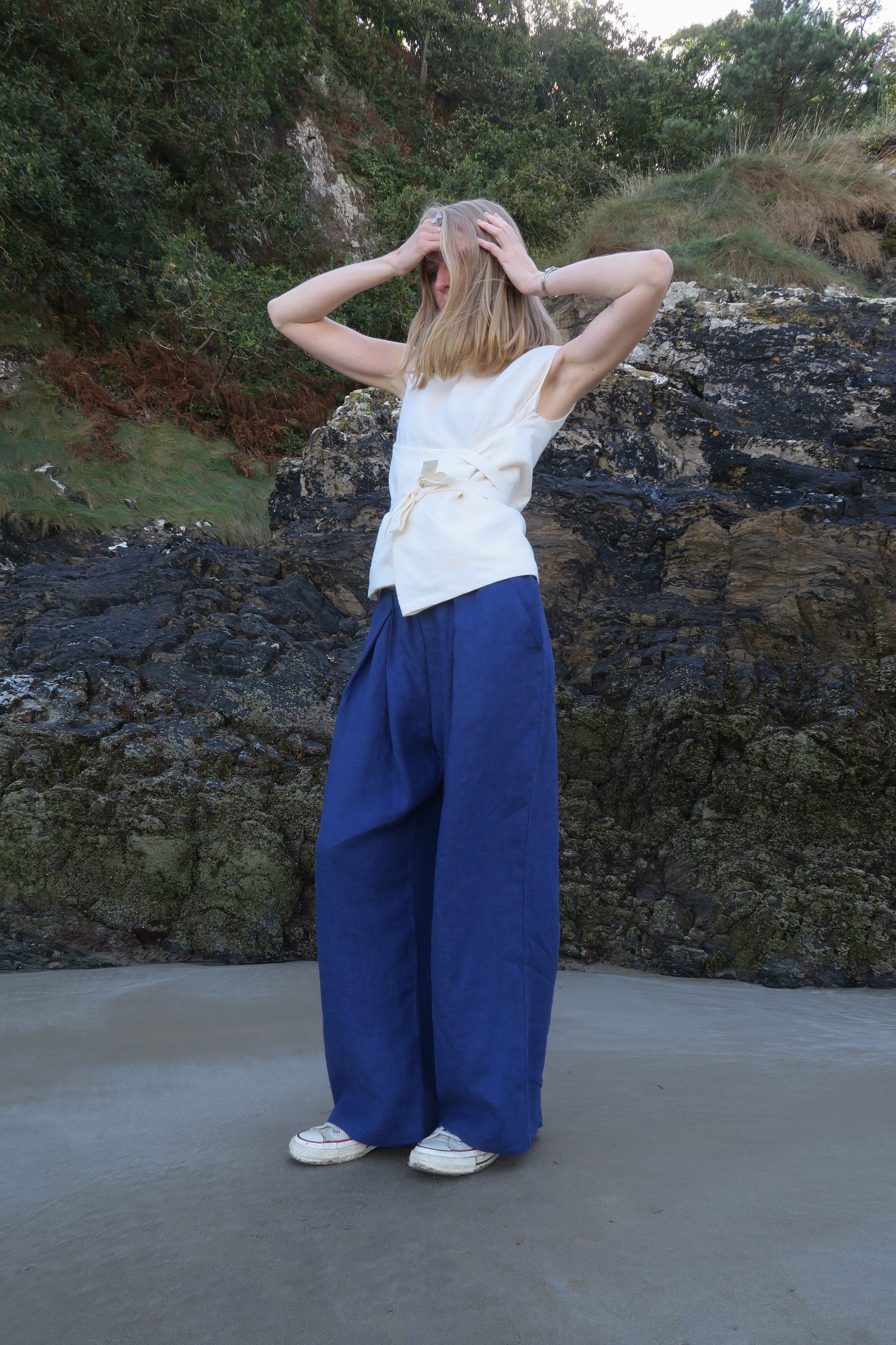 Handmade linen pants with pockets and elasticated waist. Can be worn low waist or worn higher. Very comfortable and flowy, relaxed fit. Soft and breathable linen. Blue linen in photos, I am wearing size L, I am usually size EU 42 for bottoms.